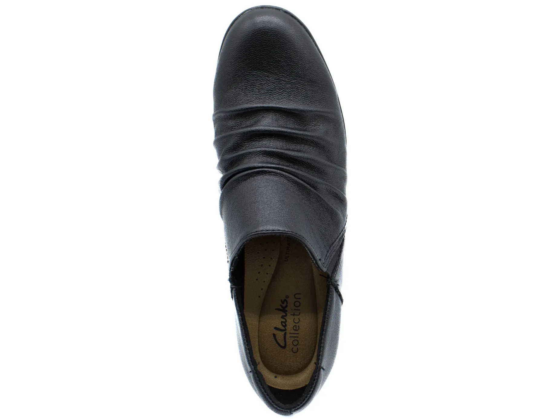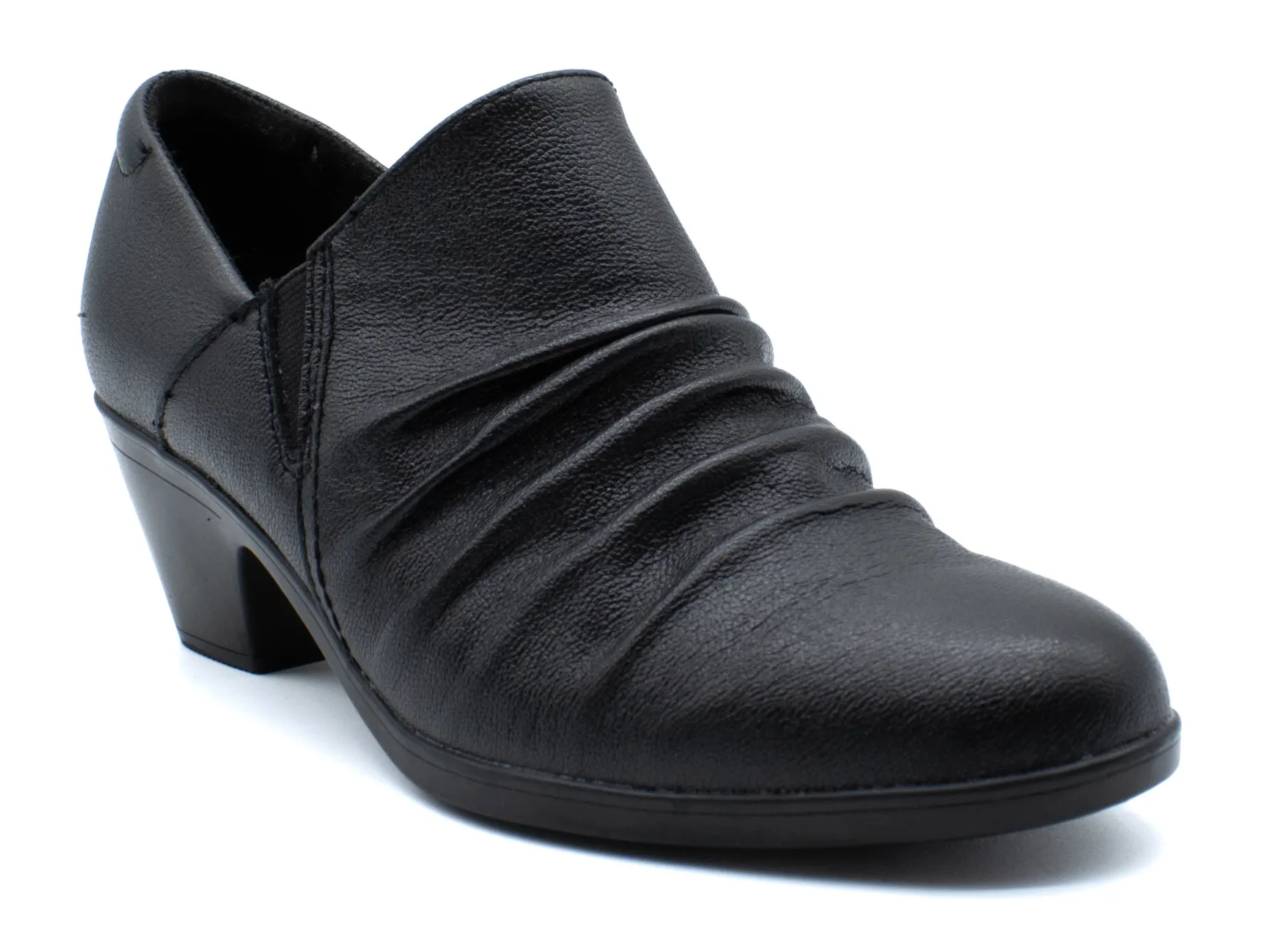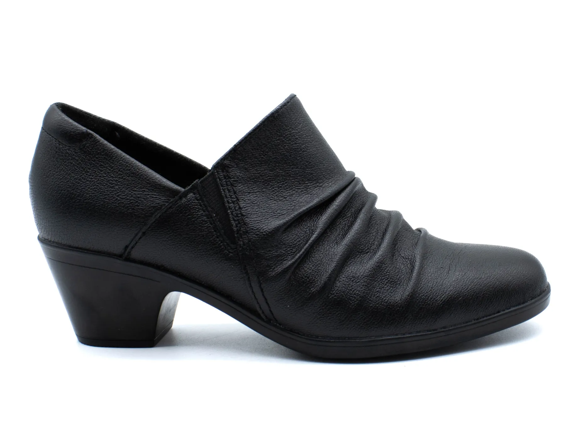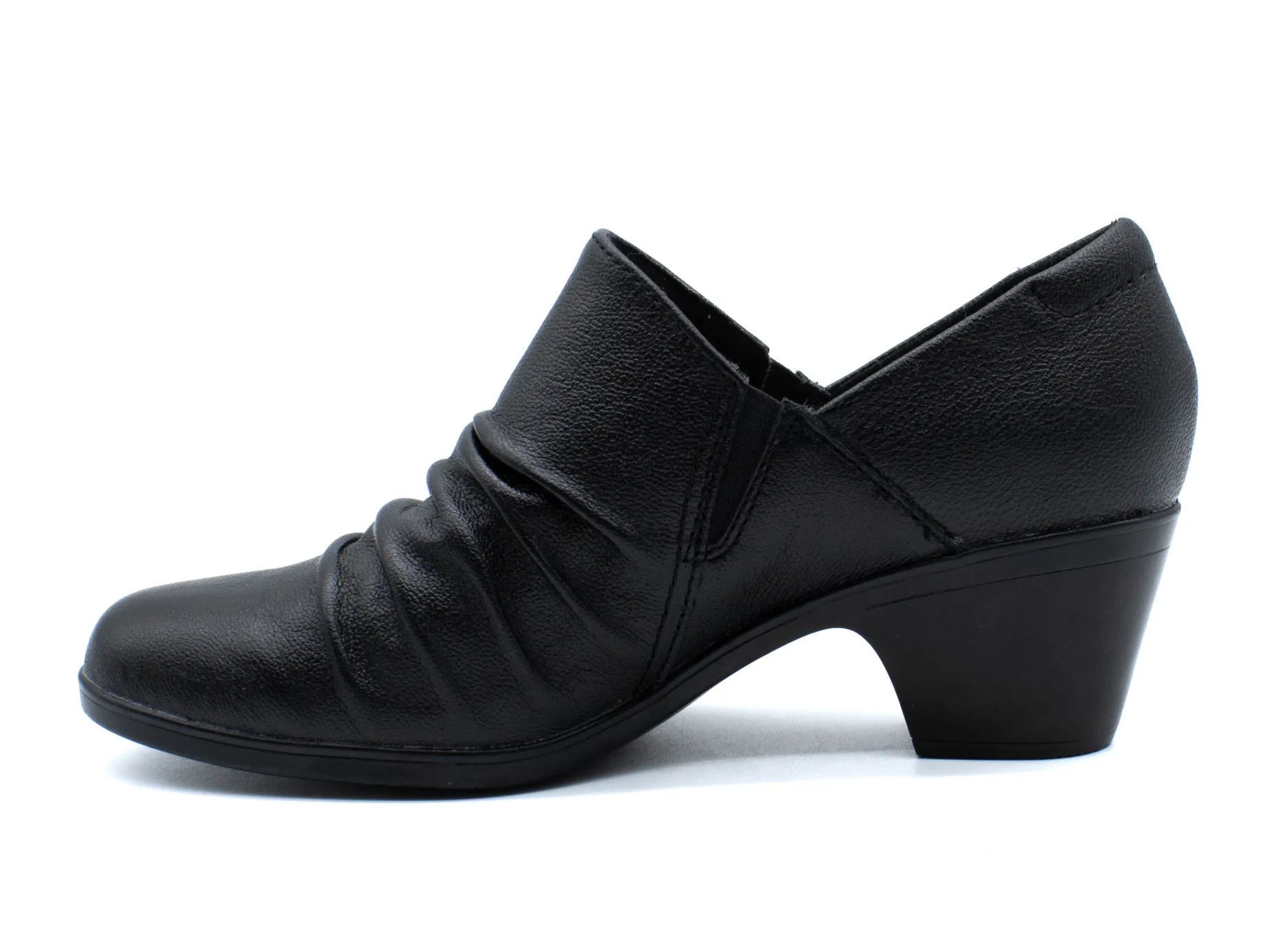 Exhibit your competitive tendency in the fashion sphere wearing the versatile Emily 2 Cove black dress pumps from Clarks. These slip-ons are designed with ruched leather upper construction and Ultimate Comfort PU foam cushioning footbed. Elasticized goring panels for an easier on and off. The Emily 2 Cove is designed with a grippy TPR outsole.