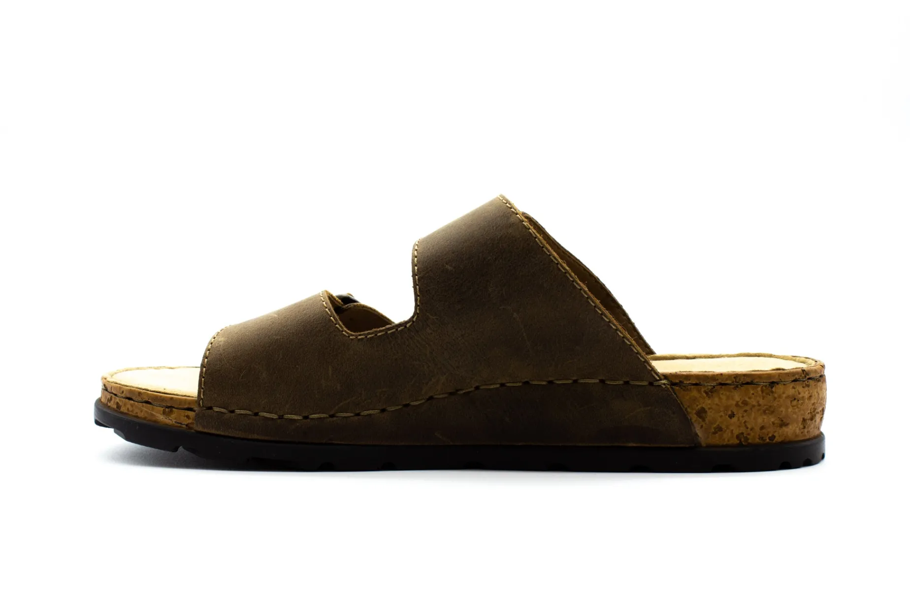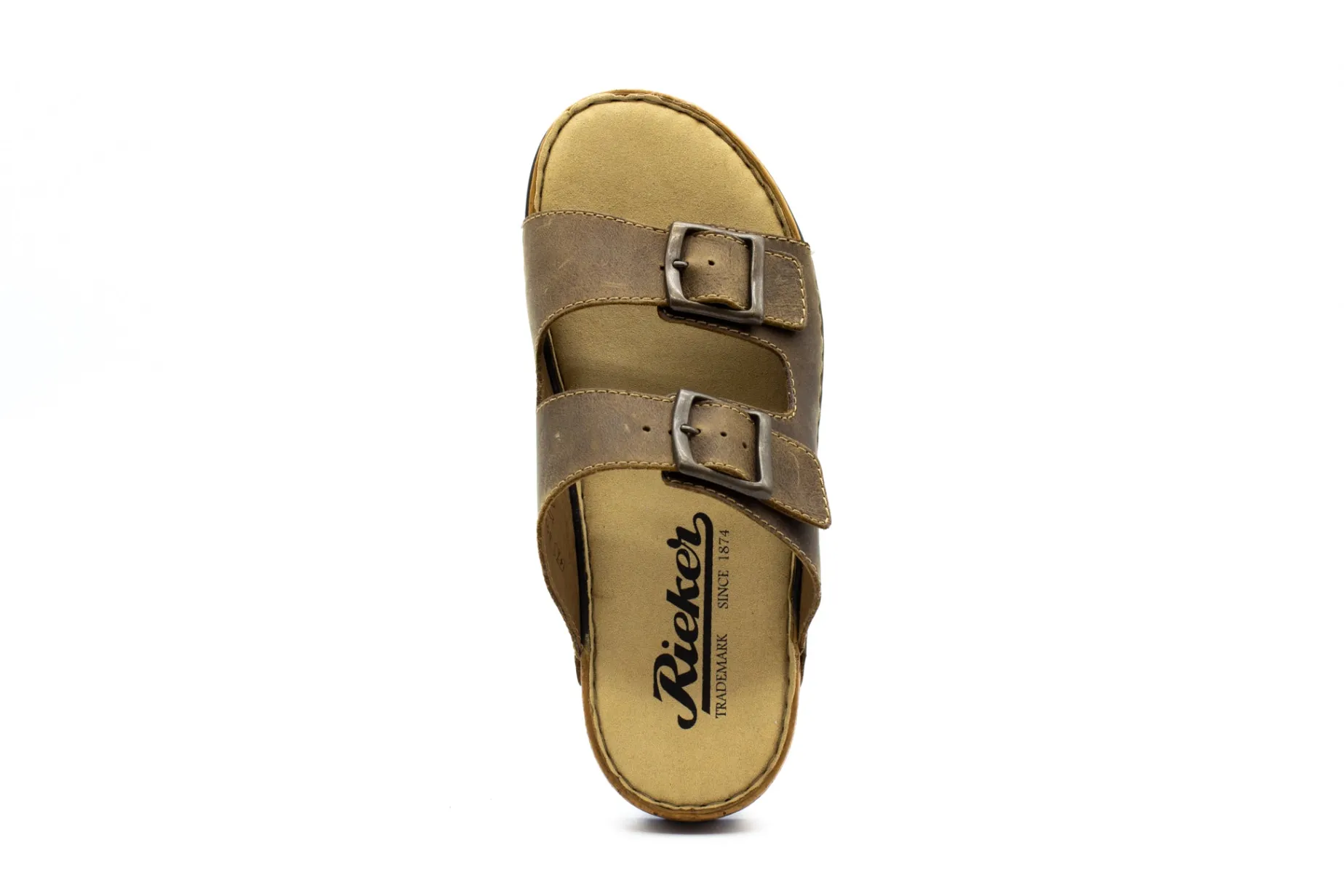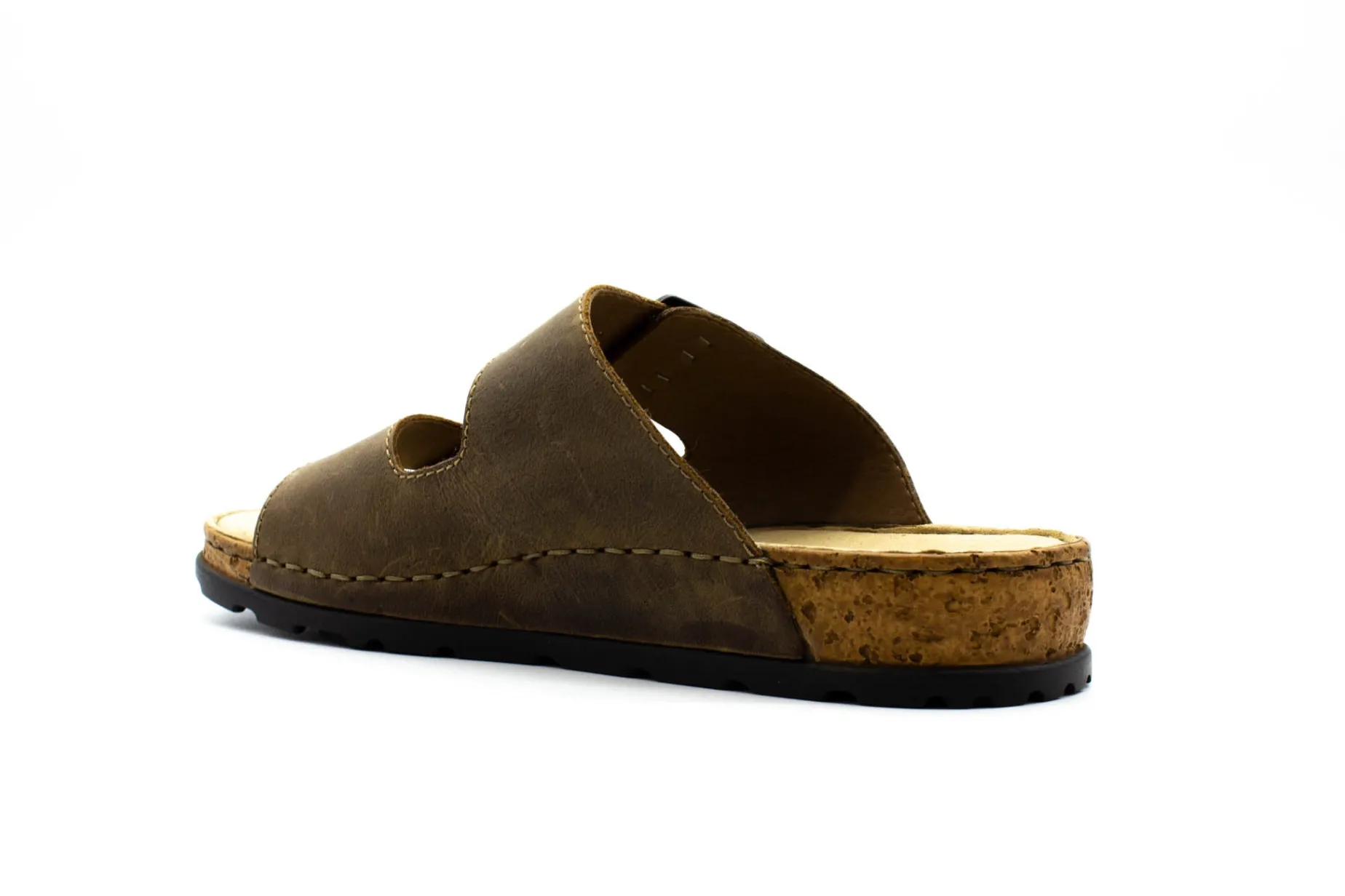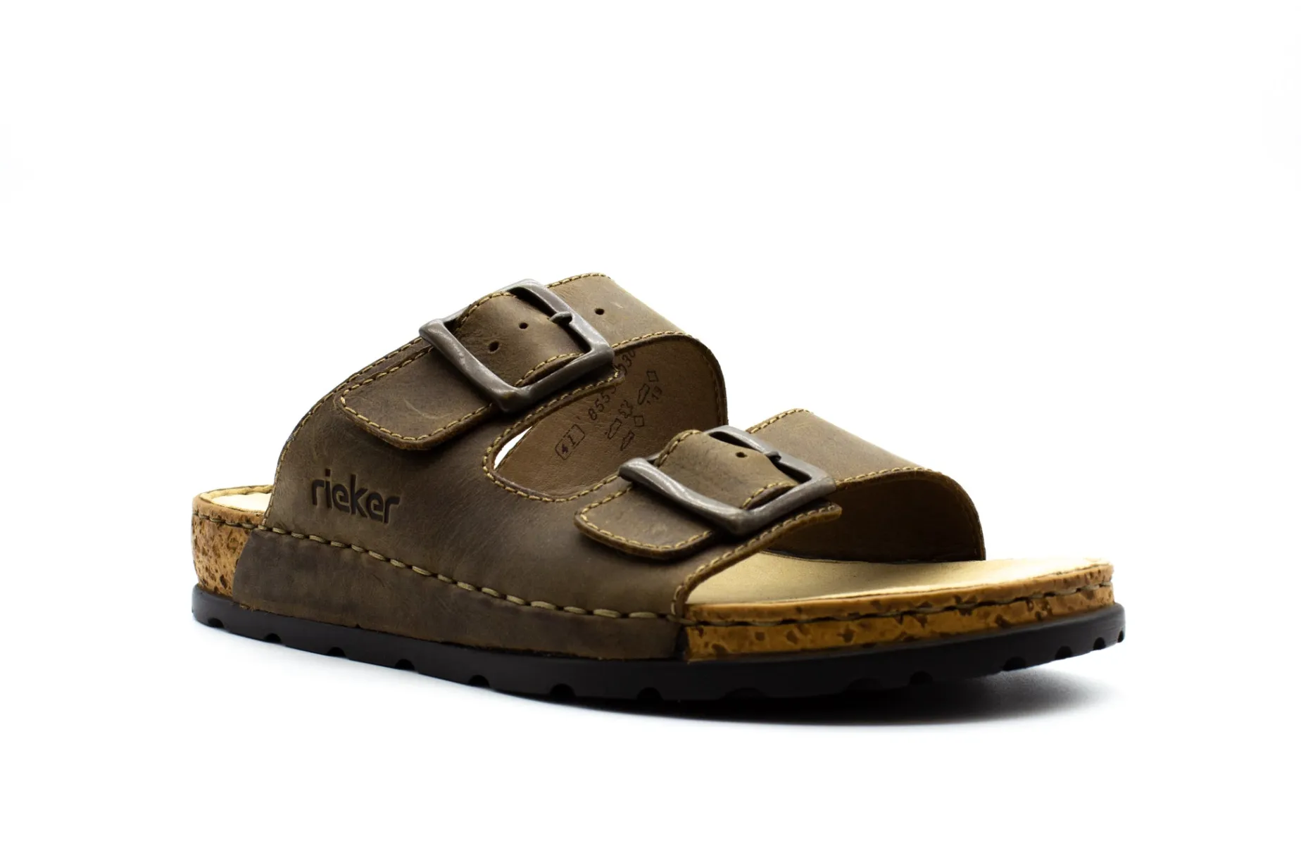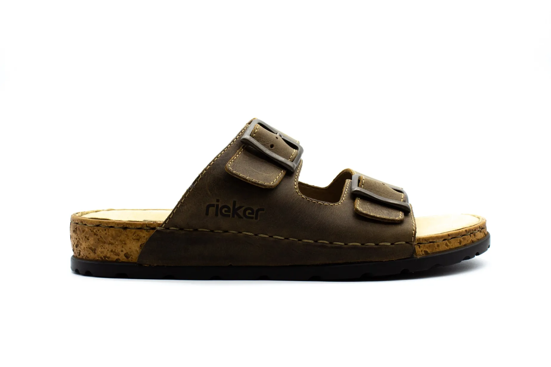 Mules, especially two-strap mules, are very popular with men in summer. They are quick to put on, can be worn almost all the time, and are very comfortable. Rieker’s new men’s model tops all this with a masculine design. It is created by processing brown leather for the straps and a synthetic material from which the flexible outsole with its cork-look border is made. The straps are also lined with imitation leather for a comfortable feel on your foot. The synthetic insole is also very important for high wearing comfort. The two large buckles can be adjusted to five widths, so the shoe fits just about any foot.