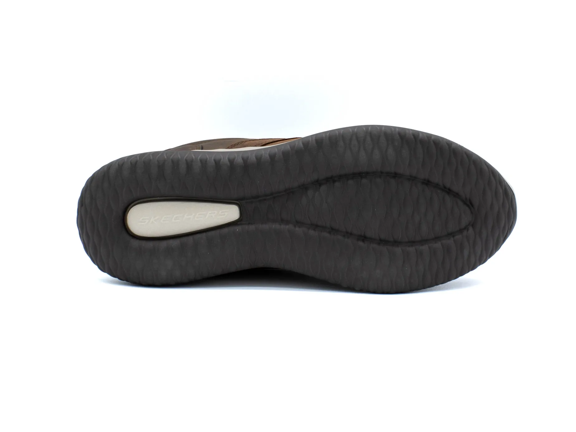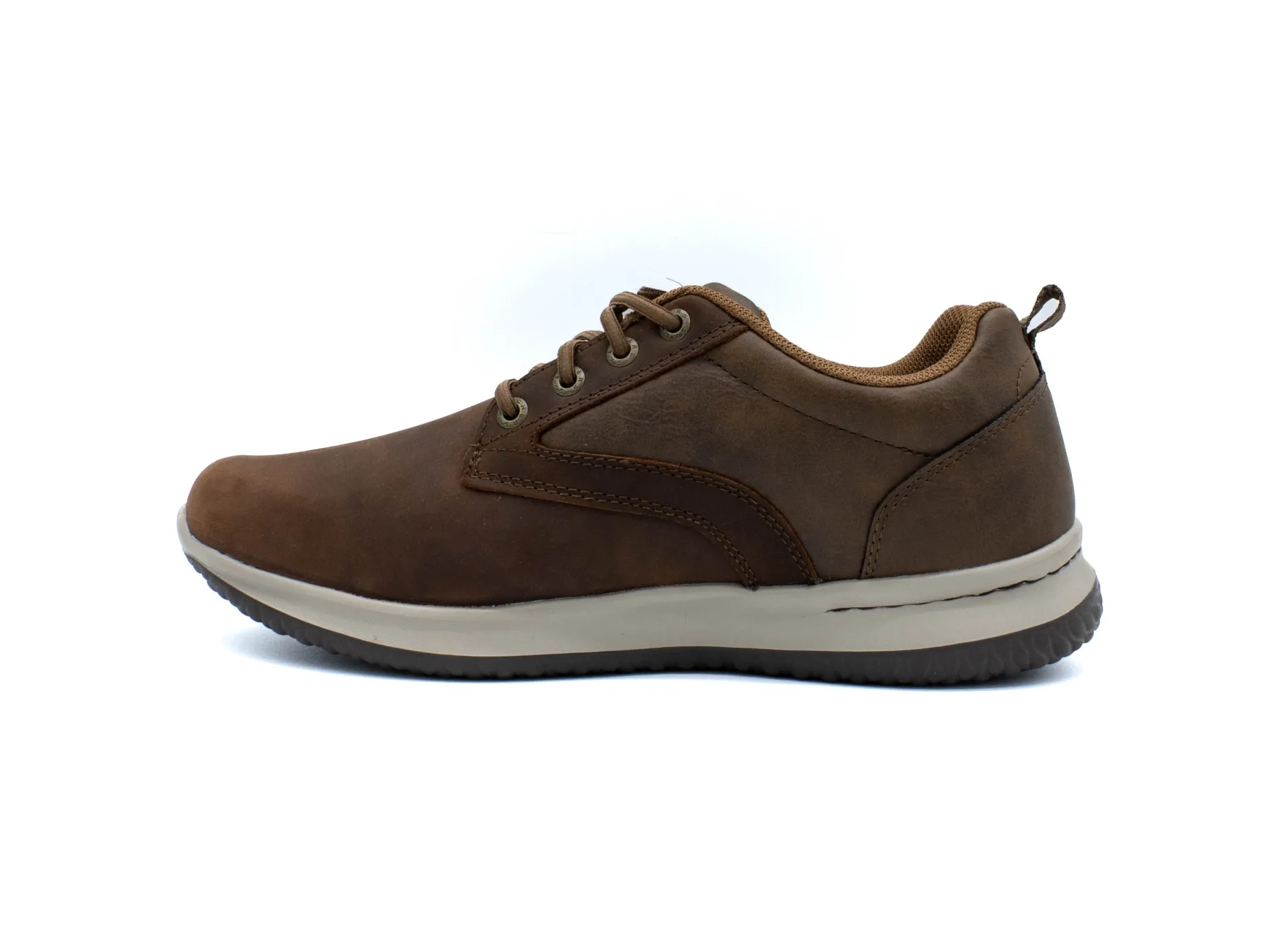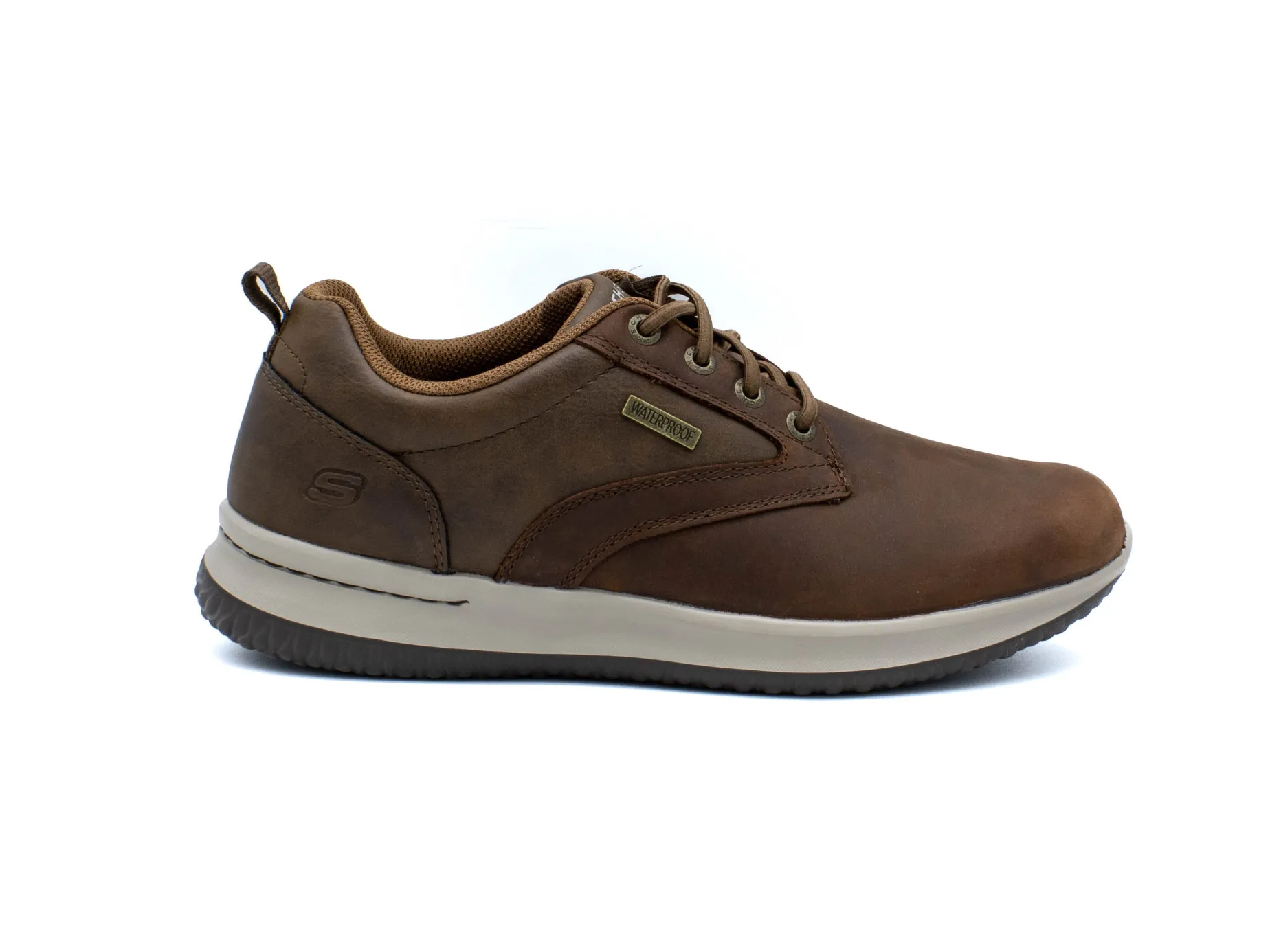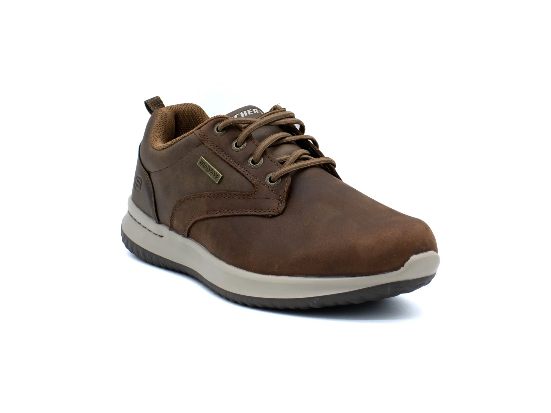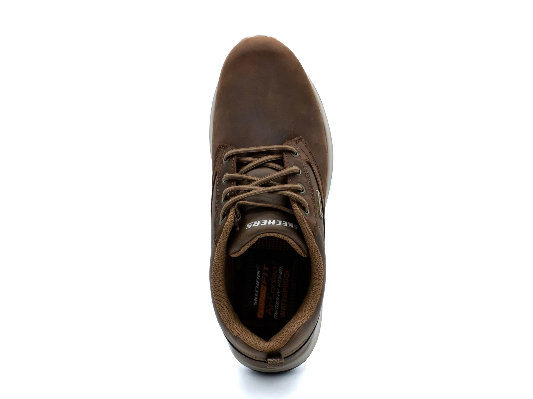 Take style and comfort everywhere with SKECHERS Delson – Antigo. Smooth leather upper in casual and waterproof oxford comfort with laces, stitches and decorative overlays. SKECHERS Air Cooled Memory Foam insole and flexible midsole.