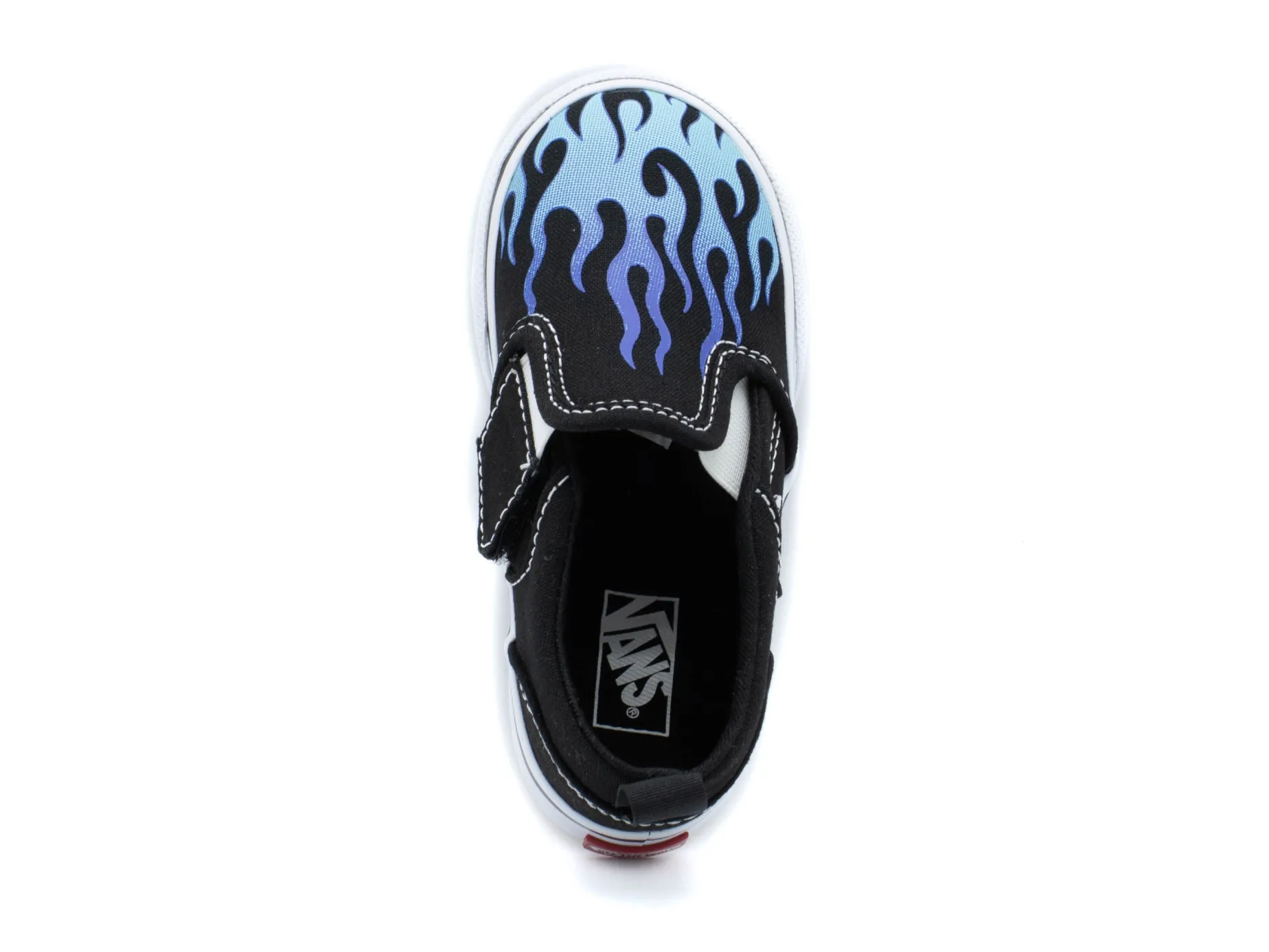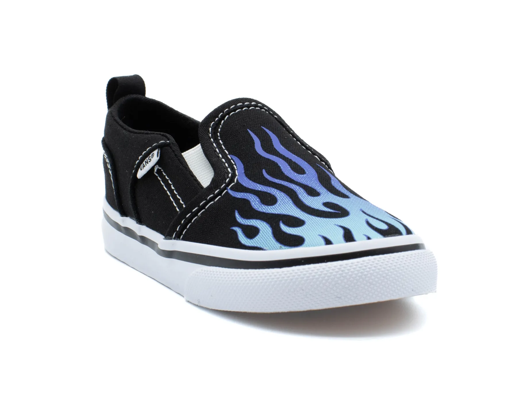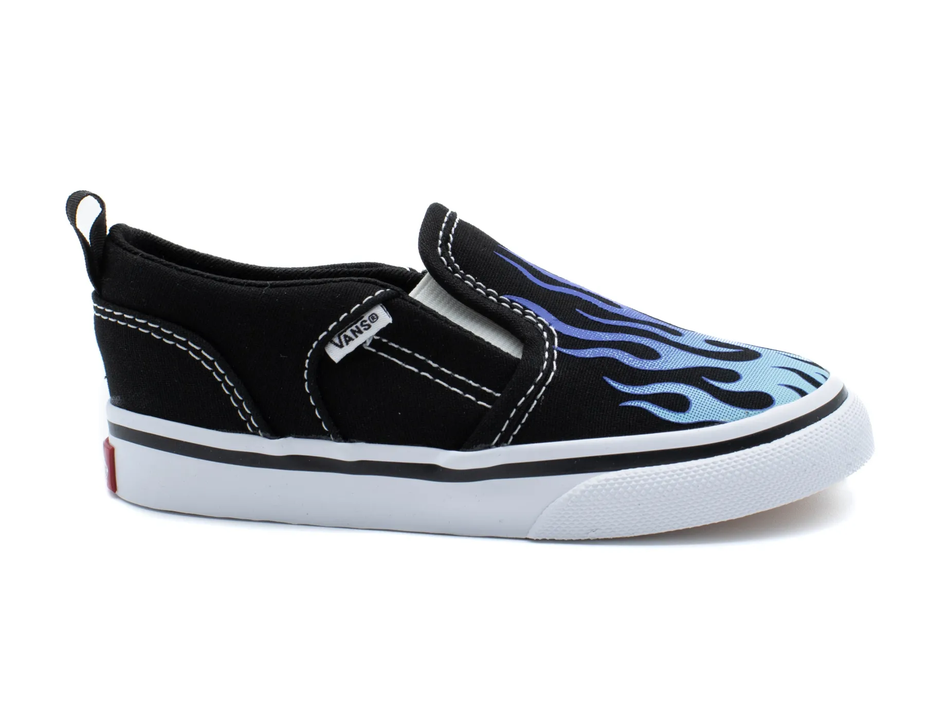 Dress your little one in a cool skate park style in the Asher Flame black/ white slip on sneaker from Vans. The Asher, a heritage low top, features a canvas upper and a signature rubber micro-waffle outsole. Its padded collar and insole, along with vulcanized construction give this very comfortable style the utmost in durability.
