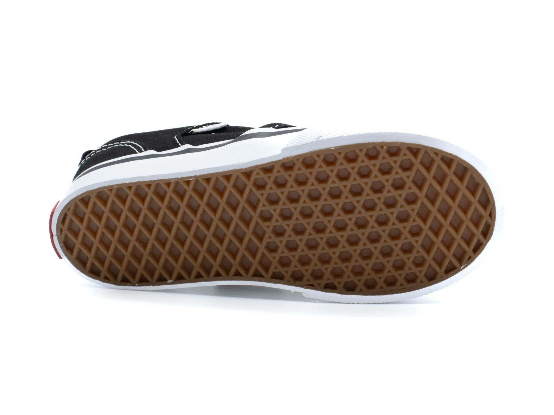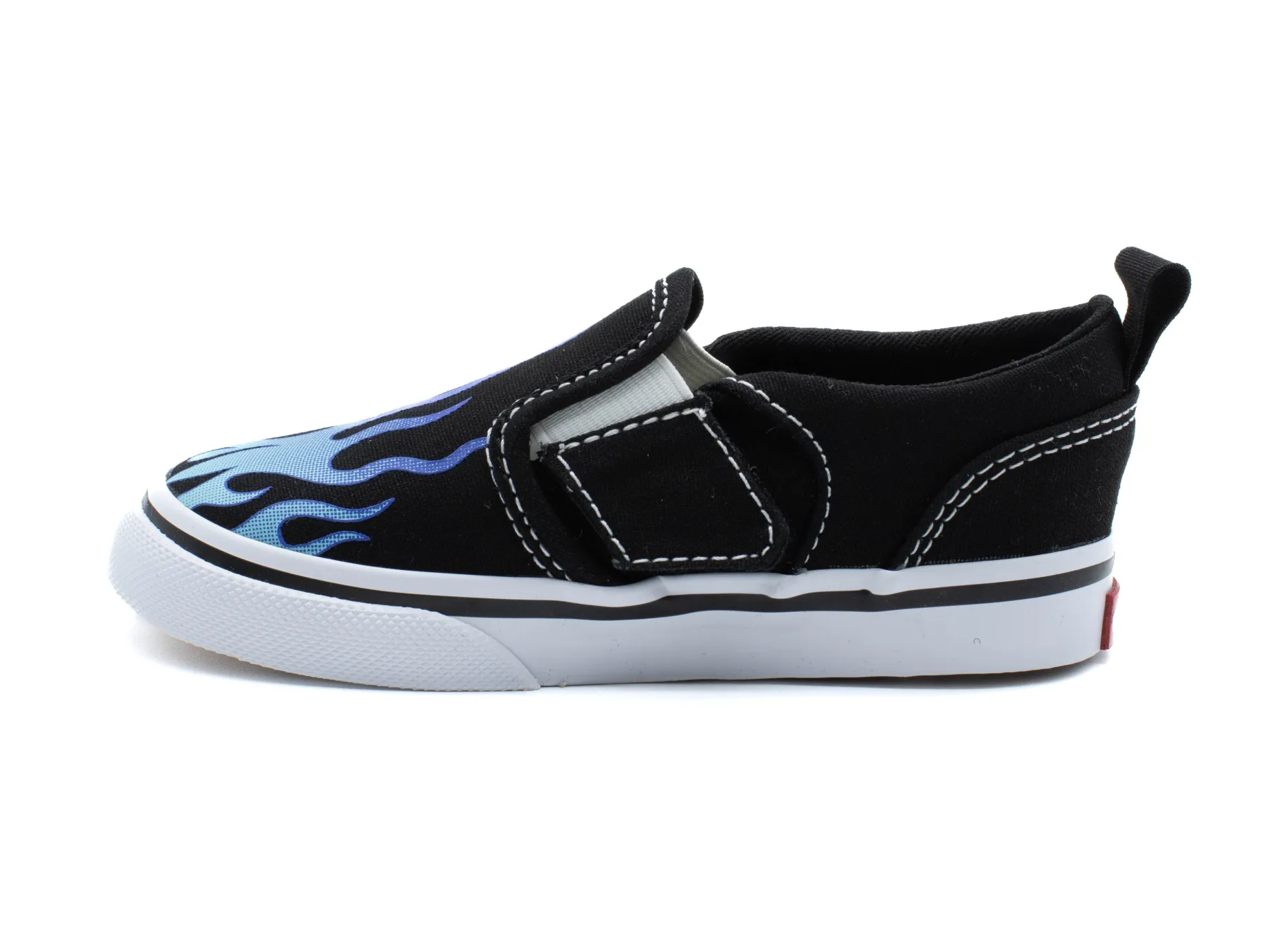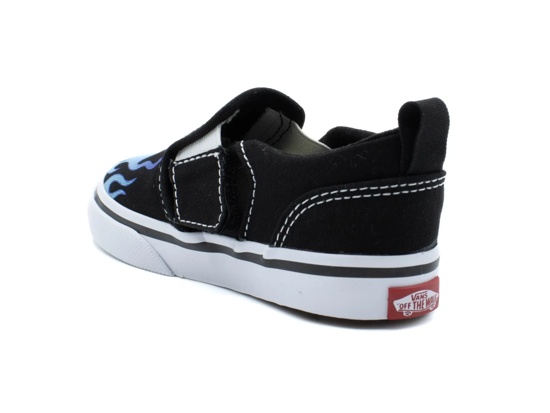 Dress your little one in a cool skate park style in the Asher Flame black/ white slip on sneaker from Vans. The Asher, a heritage low top, features a canvas upper and a signature rubber micro-waffle outsole. Its padded collar and insole, along with vulcanized construction give this very comfortable style the utmost in durability.