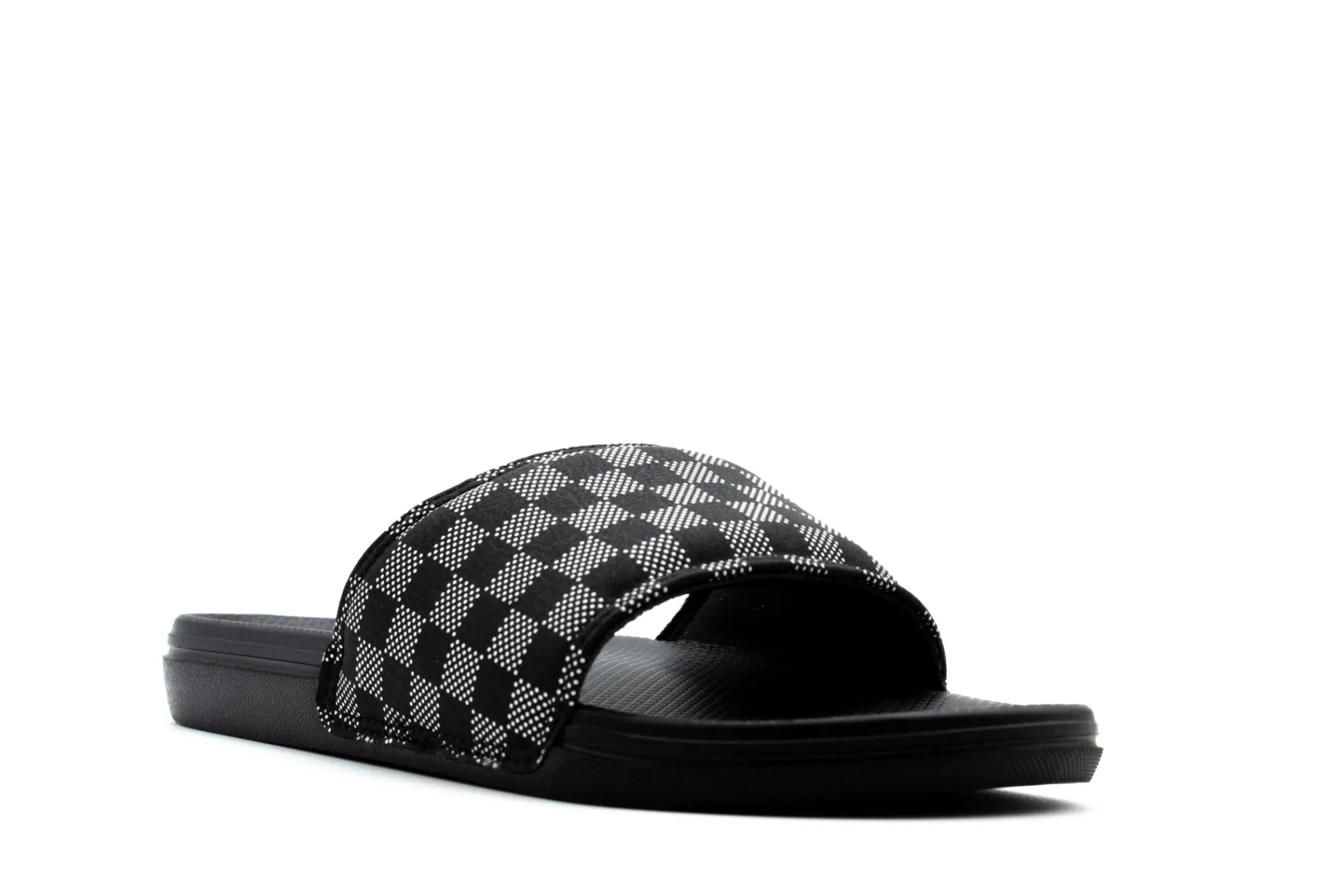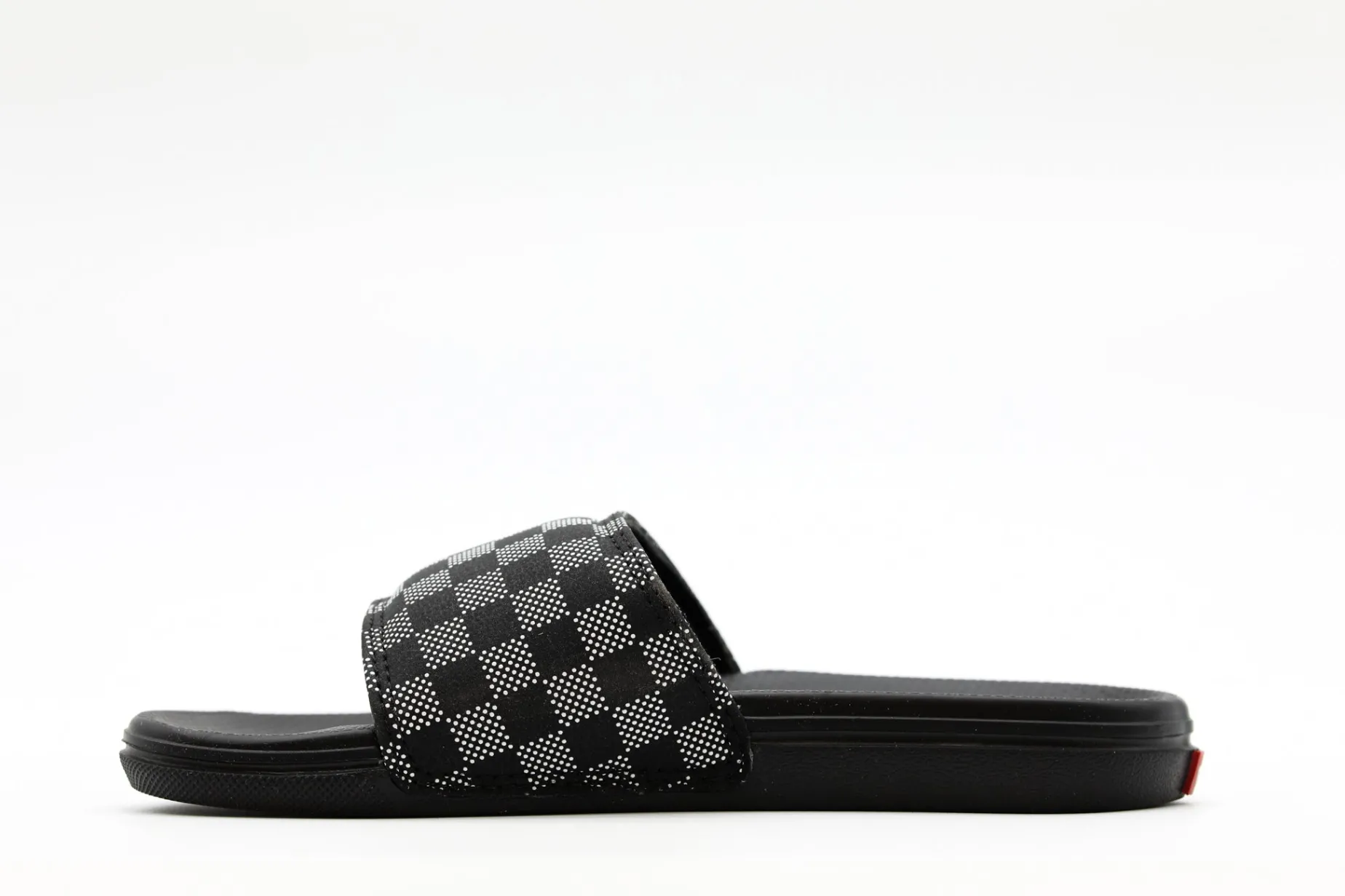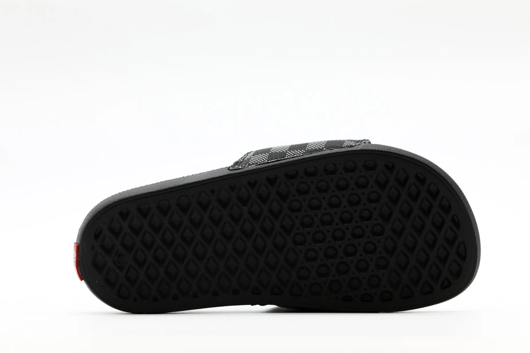 Offering ultimate comfort and all-day ease, the Range Slide On checkered black slide sandal from Vans featuring synthetic leather straps with foam-backed soft stretch textile liners, heritage-inspired print details, and molded and durable PU footbeds with anatomical arch support. It is made with water-based inks and glues. Perfect for slipping on last minute to run out of the house!