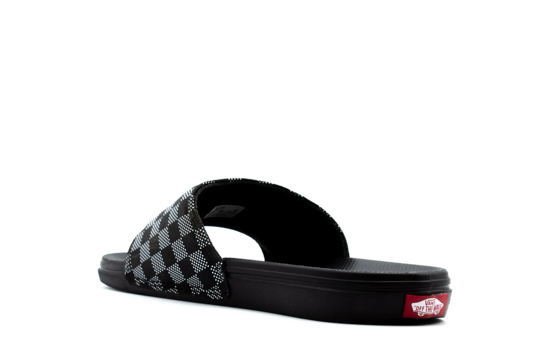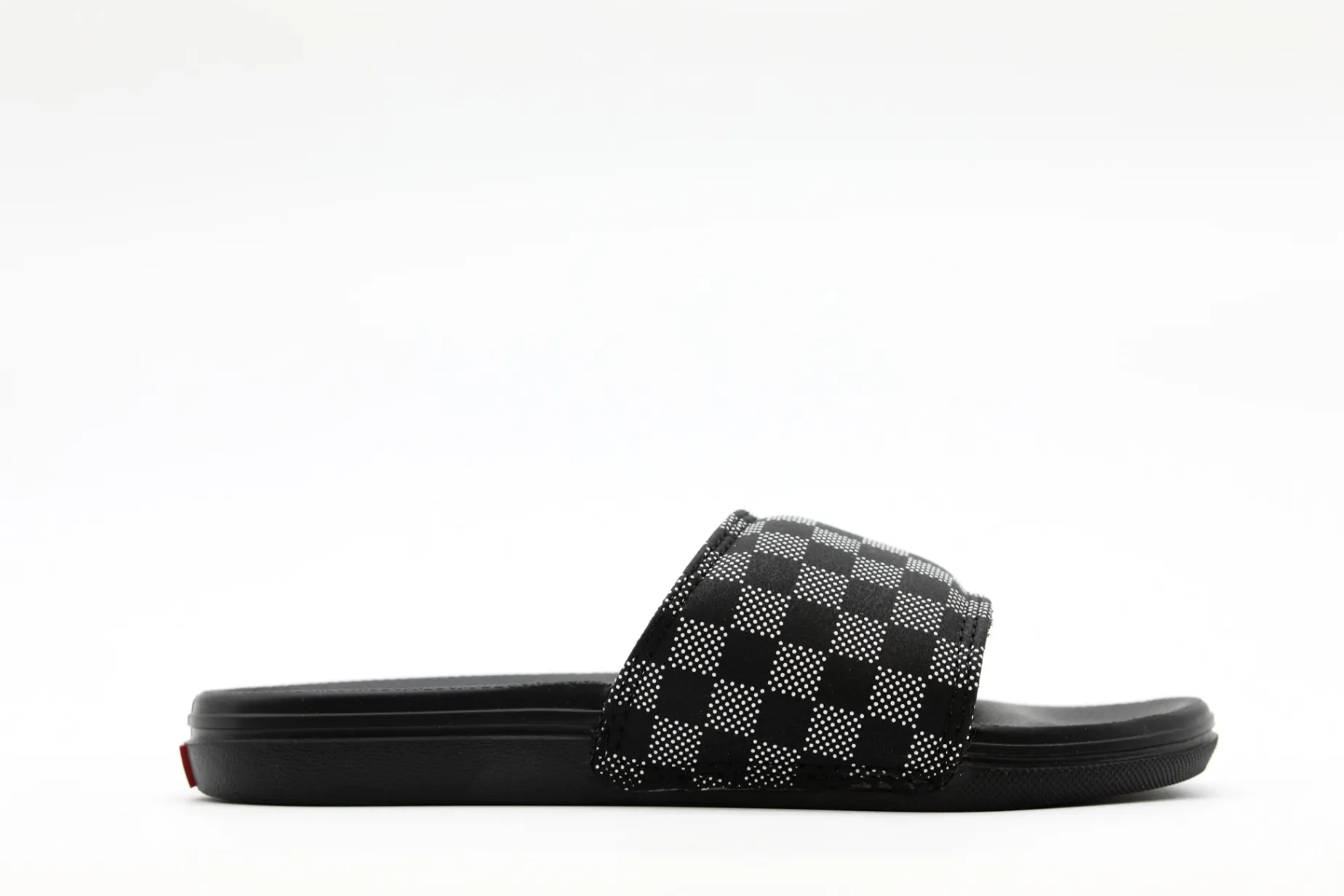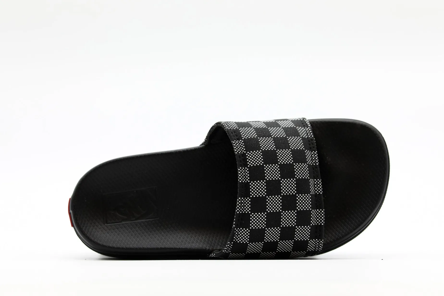 Offering ultimate comfort and all-day ease, the Range Slide On checkered black slide sandal from Vans featuring synthetic leather straps with foam-backed soft stretch textile liners, heritage-inspired print details, and molded and durable PU footbeds with anatomical arch support. It is made with water-based inks and glues. Perfect for slipping on last minute to run out of the house!